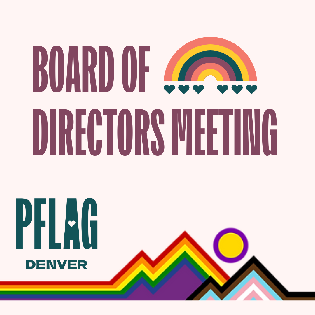 PFLAG Denver Board of Directors Meeting Wednesday, May 20, 2026 6:00 PM 8:00 PM Google Calendar ICS PFLAG Denver Board of Director’s Meeting. If you would like to attend as a guest, please email president@pflagdenver.org no less that one week before the scheduled board meeting.